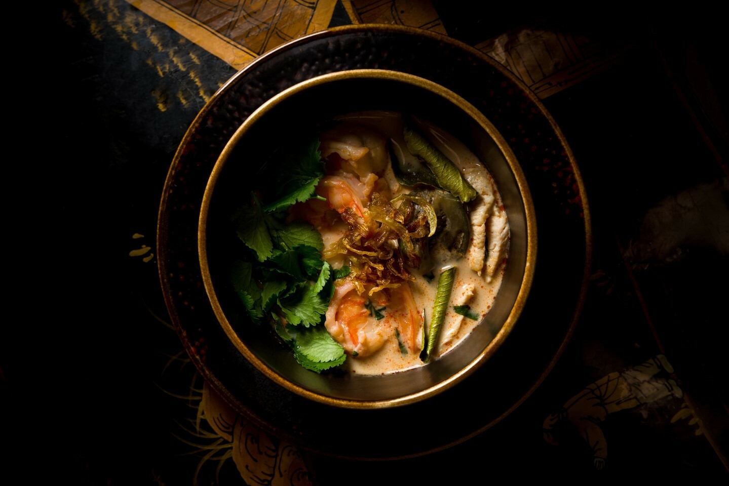 Том ям с кок-вым молоком, курицей, креве-ми тайскими баклажанами